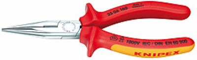 适于电子元件的夹持和剪切;尖形半圆嘴钳口;钳口表面带齿;剪切刀口适于剪切中硬线和硬线;刀口硬度约为洛氏硬度HRC61;长度160,头部镀铬,双色双重材料绝缘手柄