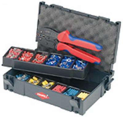 TANOS MINI-systainerTM包装(牢固的塑料盒体);两个可堆叠的塑料插入格,每个各六列,用于装连接端子;钳子97 52 36 ,每种端子各25个97 99 01/02/14 /15/16/17/18/34/35;每种端子各20个97 99 21/22/36/