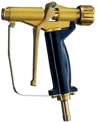 高压清洗枪(黄铜和铝制成,使用寿命长)可连接在工作压力最高到40bar的水泵上。 两种型号:一种是通过手轮进行调节的手动模式,另一种是使用扳手操作开合的安全模式。 旋转调整喷射量,从水柱到扇面,再从扇面到喷雾。