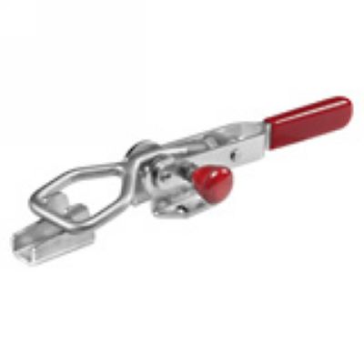 U-shackle Locks when closed. Galvanized and passivated. Case-hardened, pre-lubricated bearing bushes. Stainless steel rivets. Tempered shackle and clamping sleeve. Handle made of red, oil-resistant plastic. Supplied complete with counter catch.