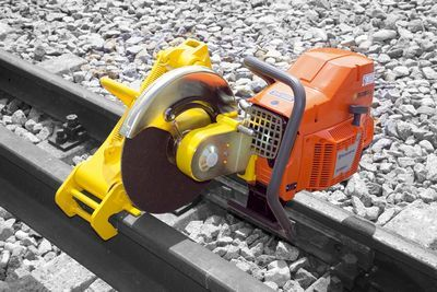 高强度轨道的快速经济切割 在工作过程中钢轨的切割通过可旋转轻金属导杆,无需转换 通过活动手柄上的张力弹簧平衡重力 电子转速控制 火花从操作人员旁边经过 切割轮直径为300mm和350mm(电动机旁为直径300mm)